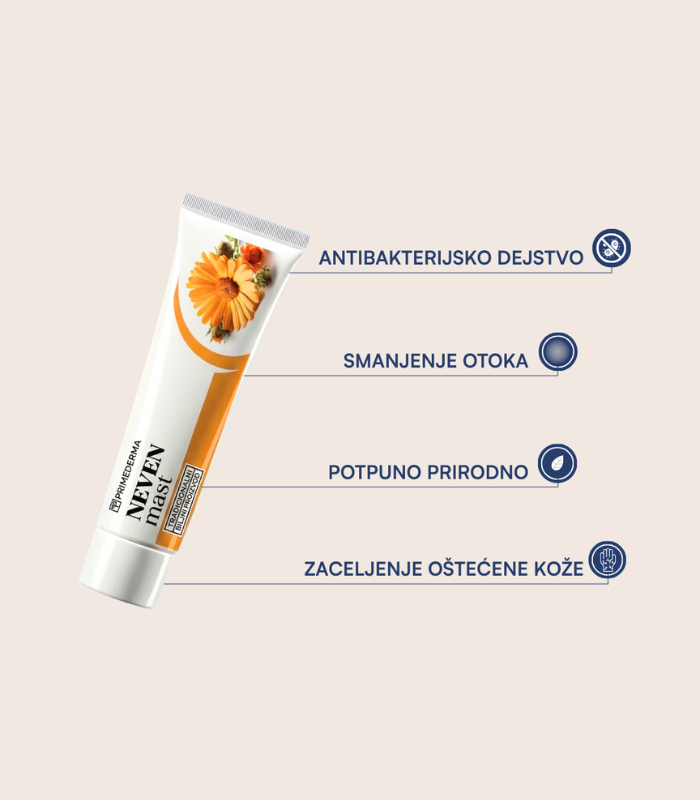 Neven nežno smiruje upalne procese, podstiče regeneraciju tkiva i pruža trenutno olakšanje crvenoj i suvoj koži, ostavljajući je mekom i zaštićenom.